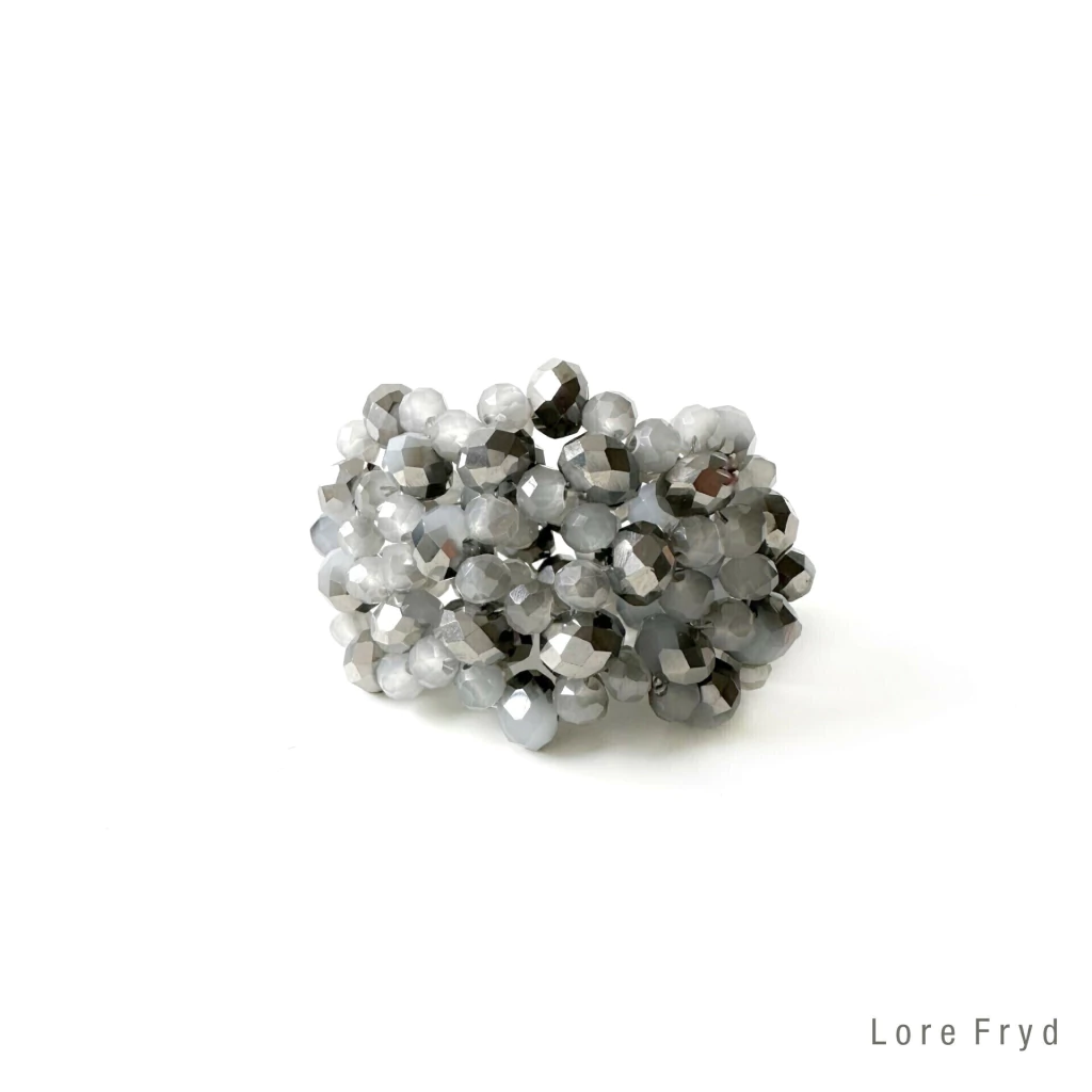 Anillo borado integramente en cristales de diferentes tamaños color gris tornasolado con plata.