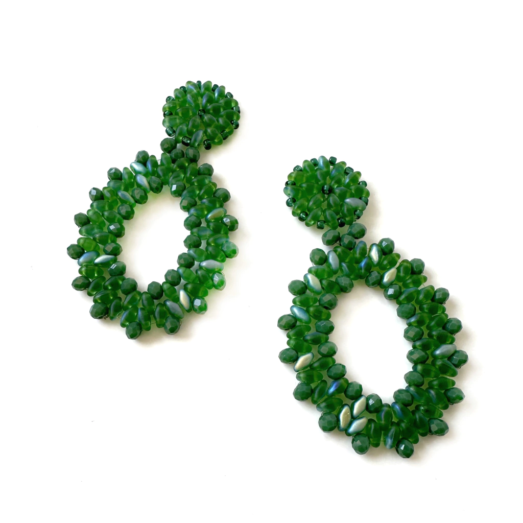 Aros elaborados con cristales checos verde tornasol y cristales verde.