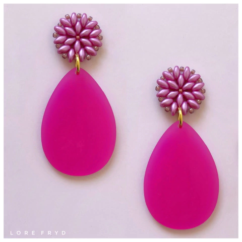 Aros elaborados con cristales checos fucsia y gota de acrílico fucsia.